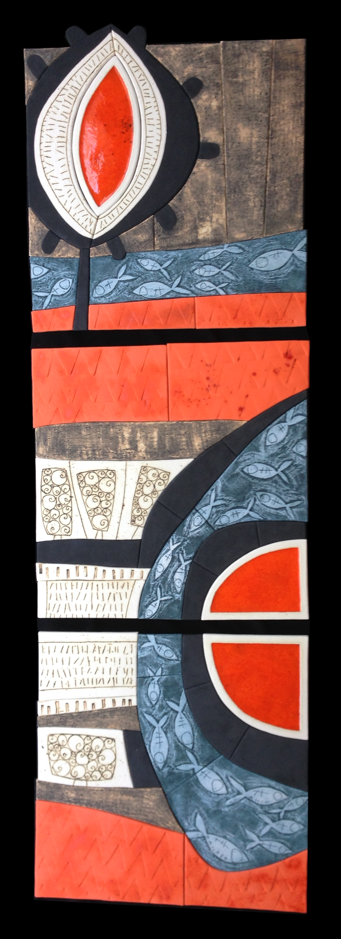 "Swimming in the Lava Island" Wall Sculpture, 18" w x 54" h, Earthenware, Glass, Oxides and Underglazes